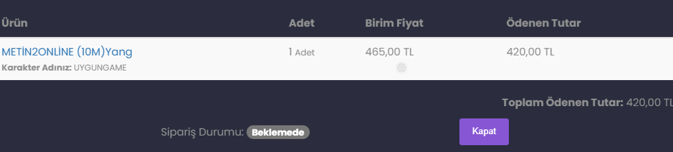 Yang teslimatını sitede sipariş verirken nicke sorunsuz şekilde yaptığınızda talebiniz onaylanacak ve yang ücreti bakiyenize yüklenecektir.